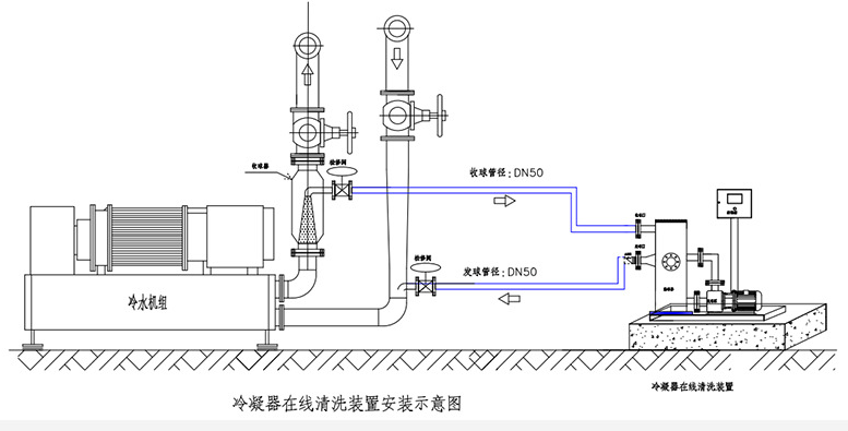 在冷却水循环管路上,加装由发球器、收球器、控制器等管路系统组成的旁路,通过发球器胶球泵将胶球注入冷凝器内,在系统自有压力的作用下,对冷凝器铜管内壁的污垢进行自动清洗,在出水口端由收球器将胶球滤回至发球器,形成一次完整的清洗循环。通过控制系统可设定清洗频率,实现自动在线清洗功能,使冷凝器铜管内壁始终处于清洁状态,提高了换热效率,并降低了能耗,从而达到节约能源的目的。